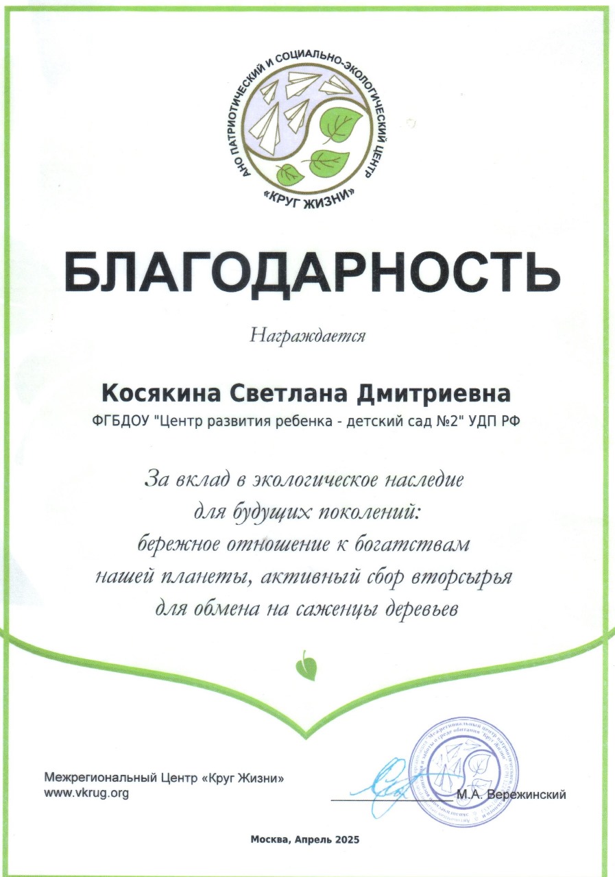 Благодарность за вклад в экологическое наследие для будущих поколений: бережное отношение к богатствам нашей планеты, активный сбор вторсырья для обмена на саженцы деревьев