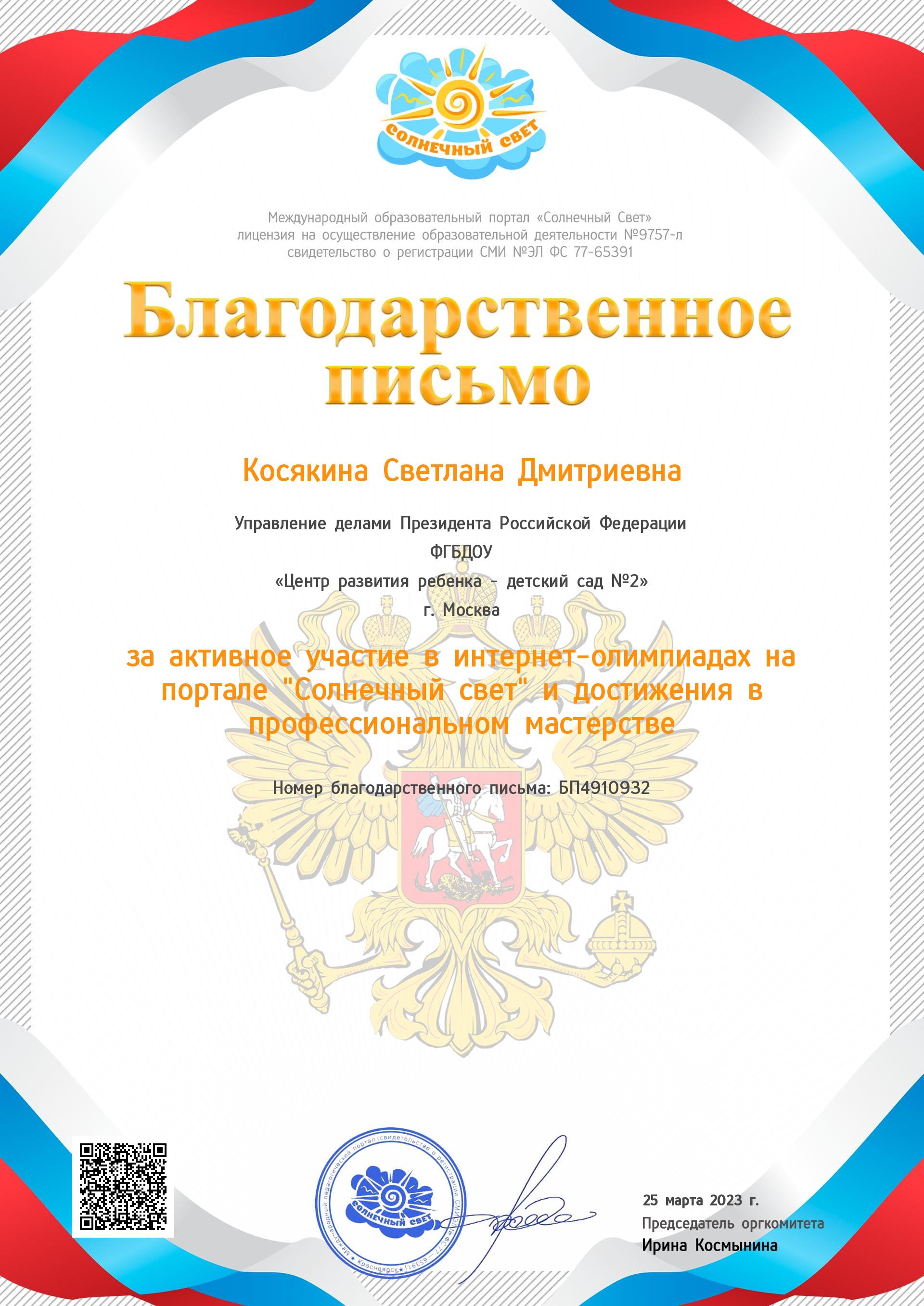 Благодарственное письмо за активное участие в интернет-олимпиадах на портале "Солнечный свет" и достижениях в профессиональном мастерстве