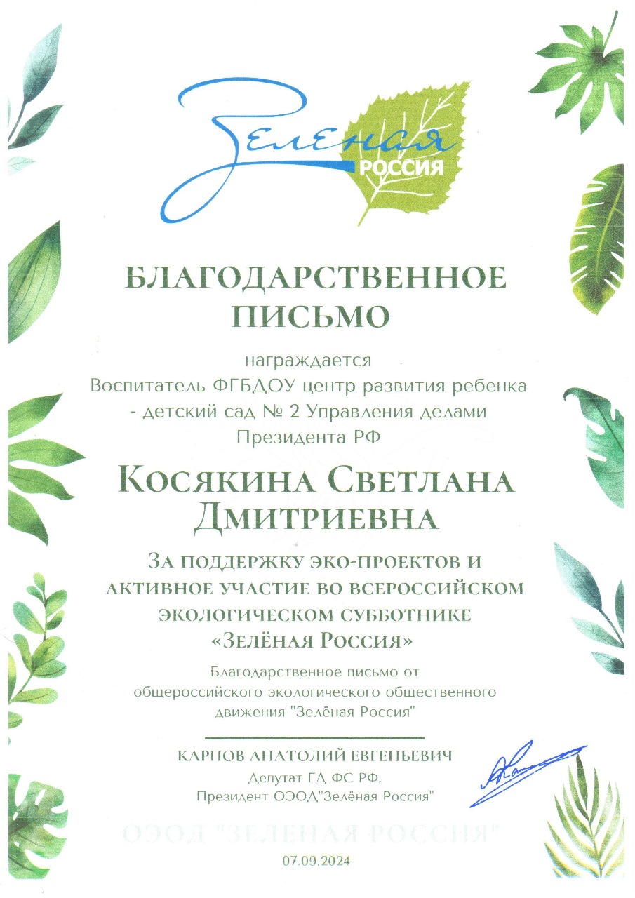 Благодарственное письмо за поддержку эко-проектов и активное участие во всероссийском экологическом субботнике "Зеленая Россия"
