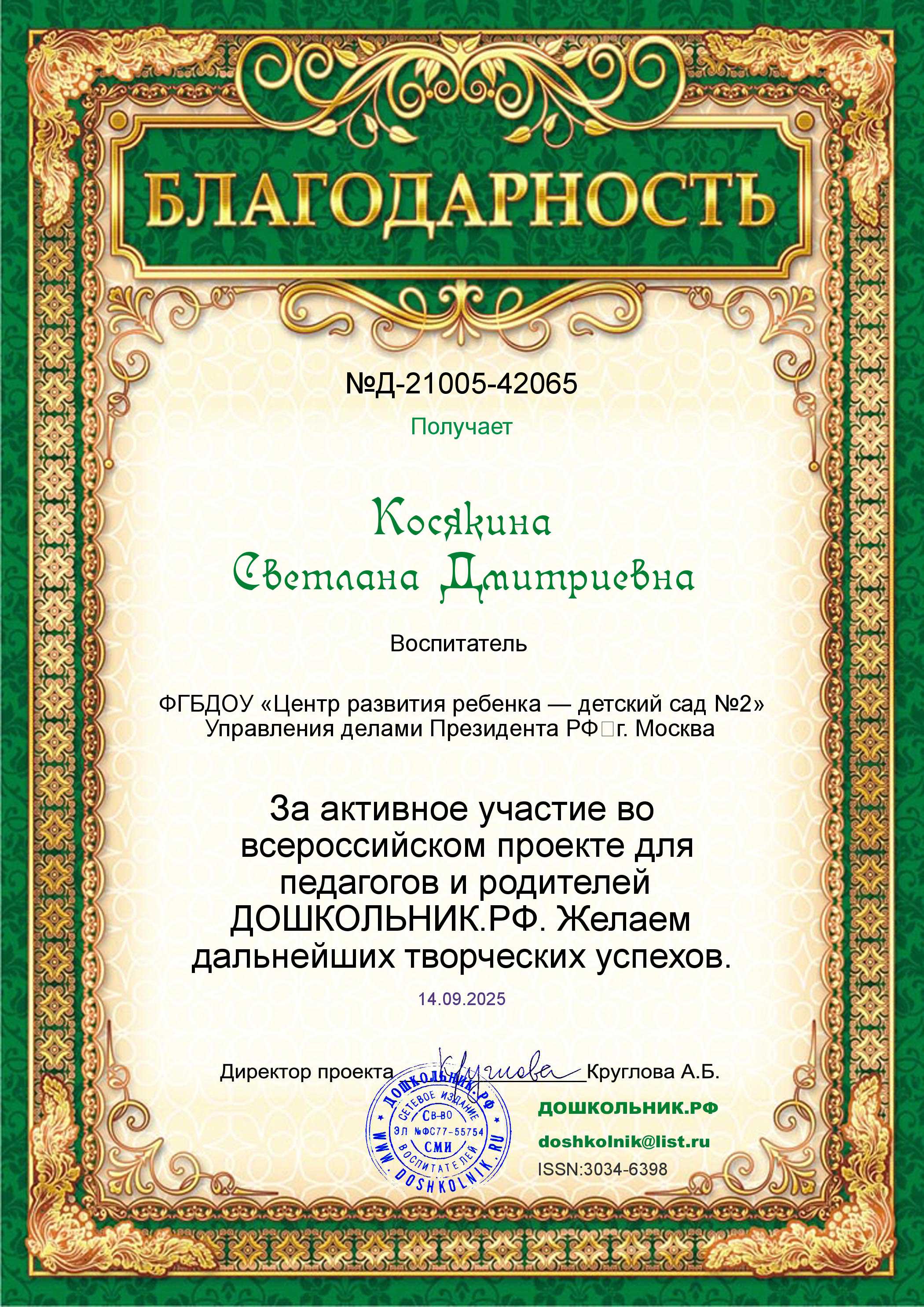 Благодарность за активное участие во всероссийском проекте для педагогов и родителей Дошкольник.РФ.