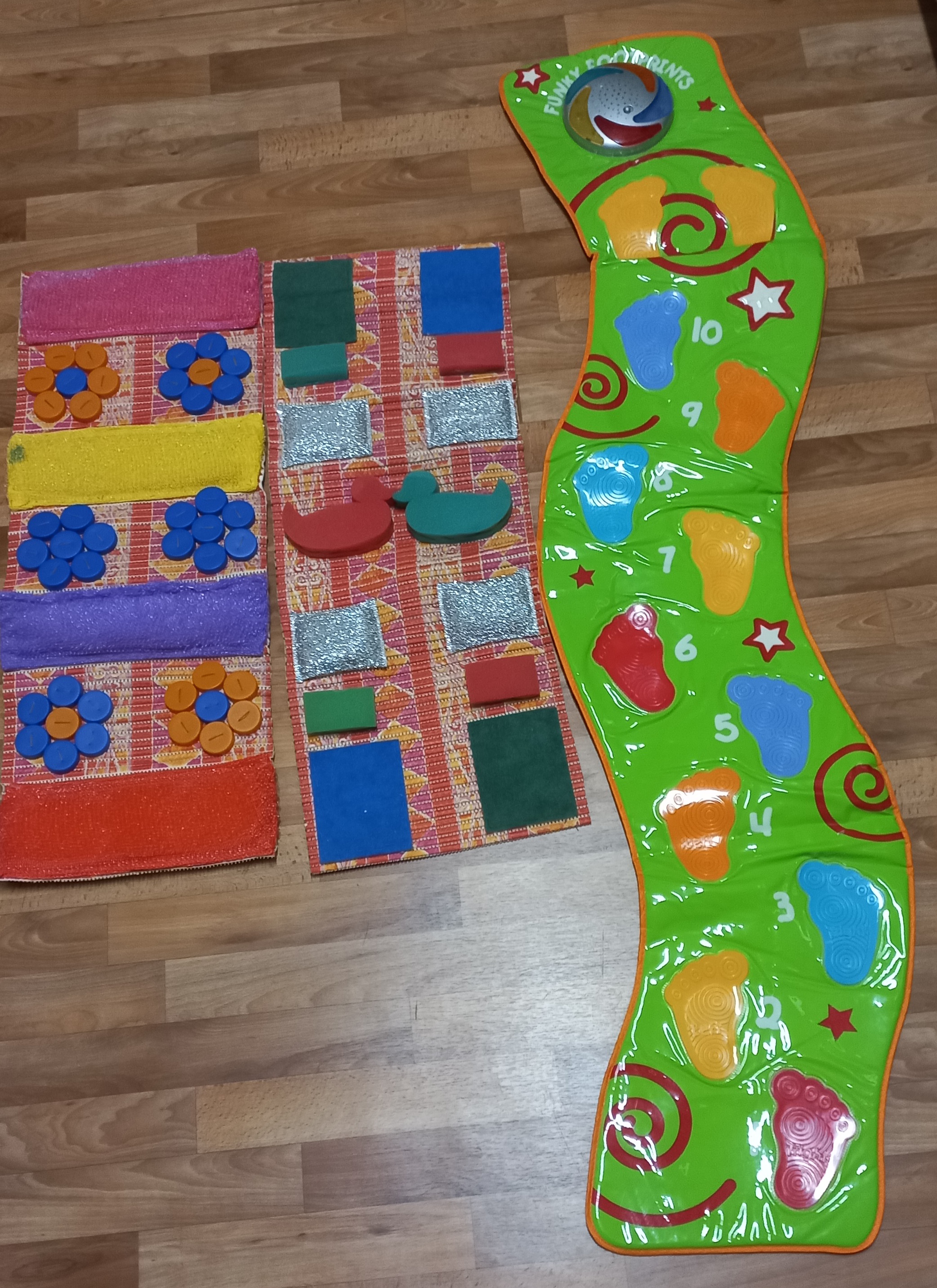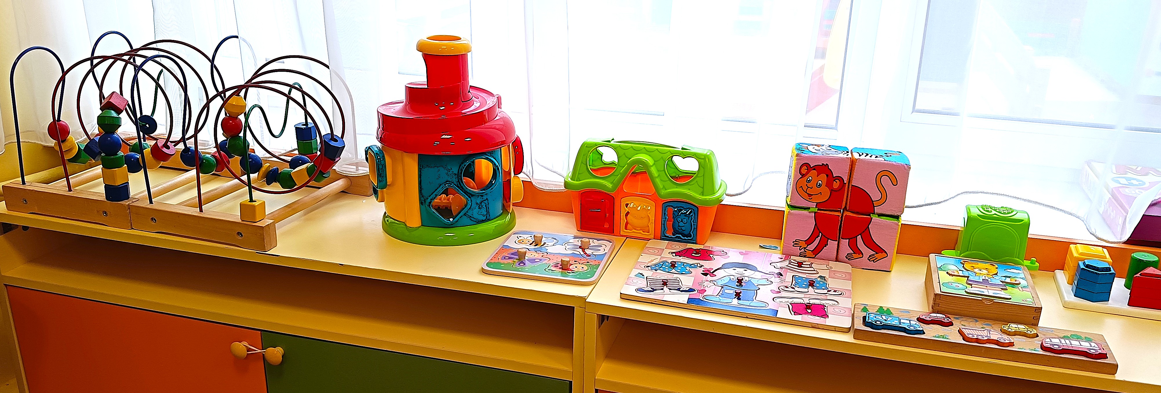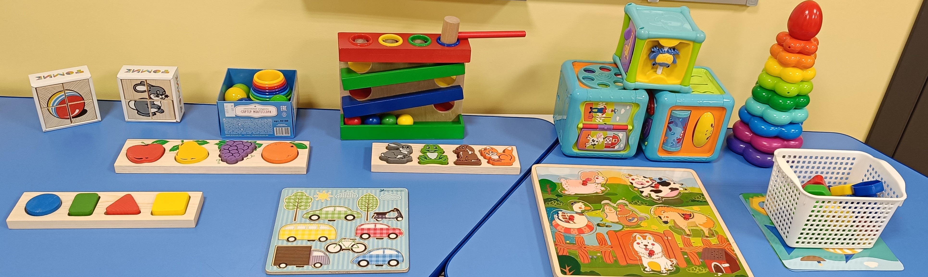 : Различные дидактические игры, направленные на ознакомление с формой, цветом и величиной, а также развитие психических процессов. Пособия для развития мелкой моторики и тактильного восприятия: шнуровки, сенсорные дощечки, бизиборды, сортеры, пирамидки, юла, неваляшки, рамки-вкладыши
