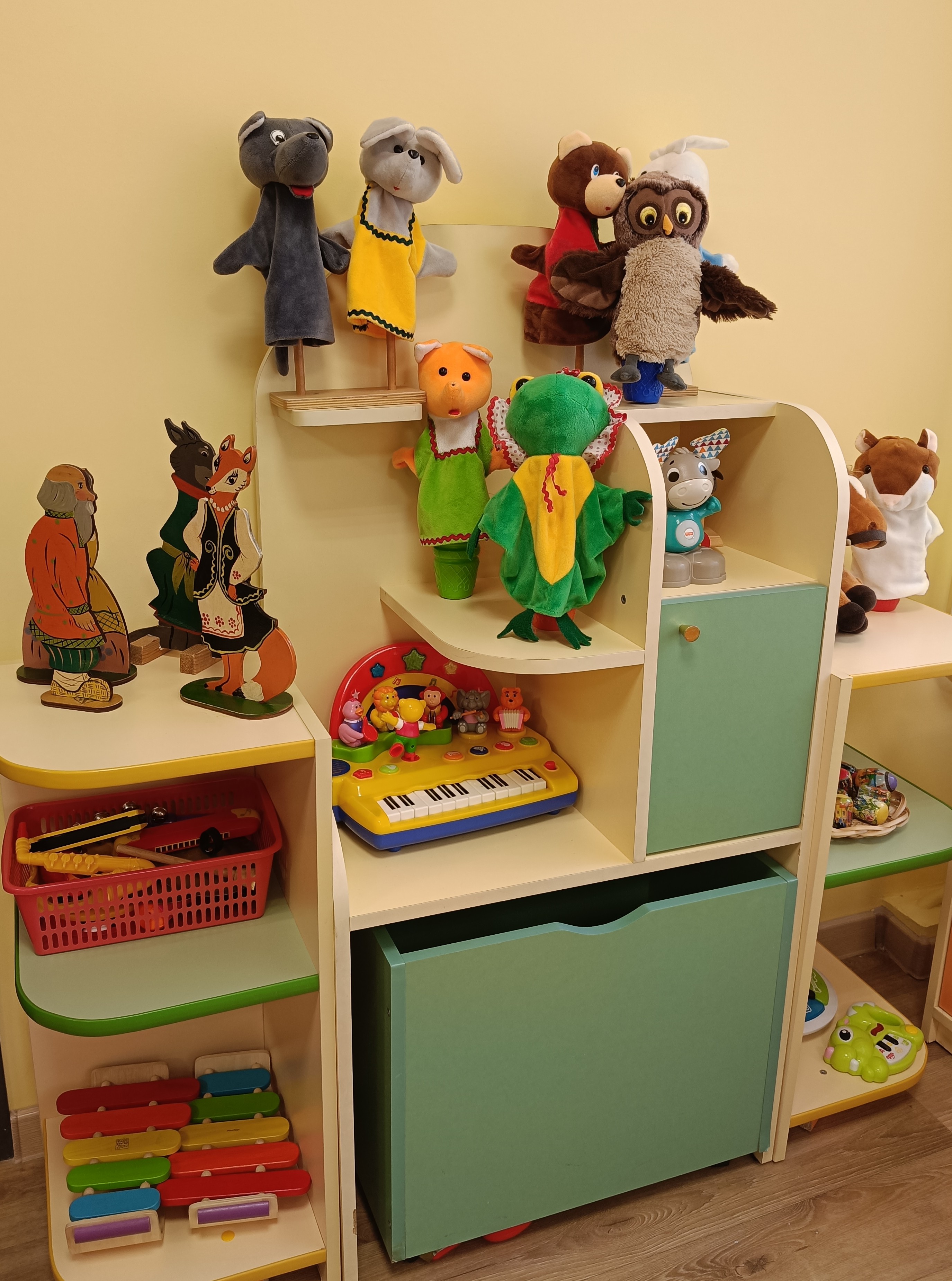 : В игровом центре представлены игрушки и различные материалы, способствующие созданию замысла; своеобразные зоны, направляющие мысль ребенка в направлении самостоятельной игры: куклы, машинки, конструкторы, фигурки людей и животных, игрушки бытового назначения, направленные на создание предпосылок к сюжетно-ролевой игре.
