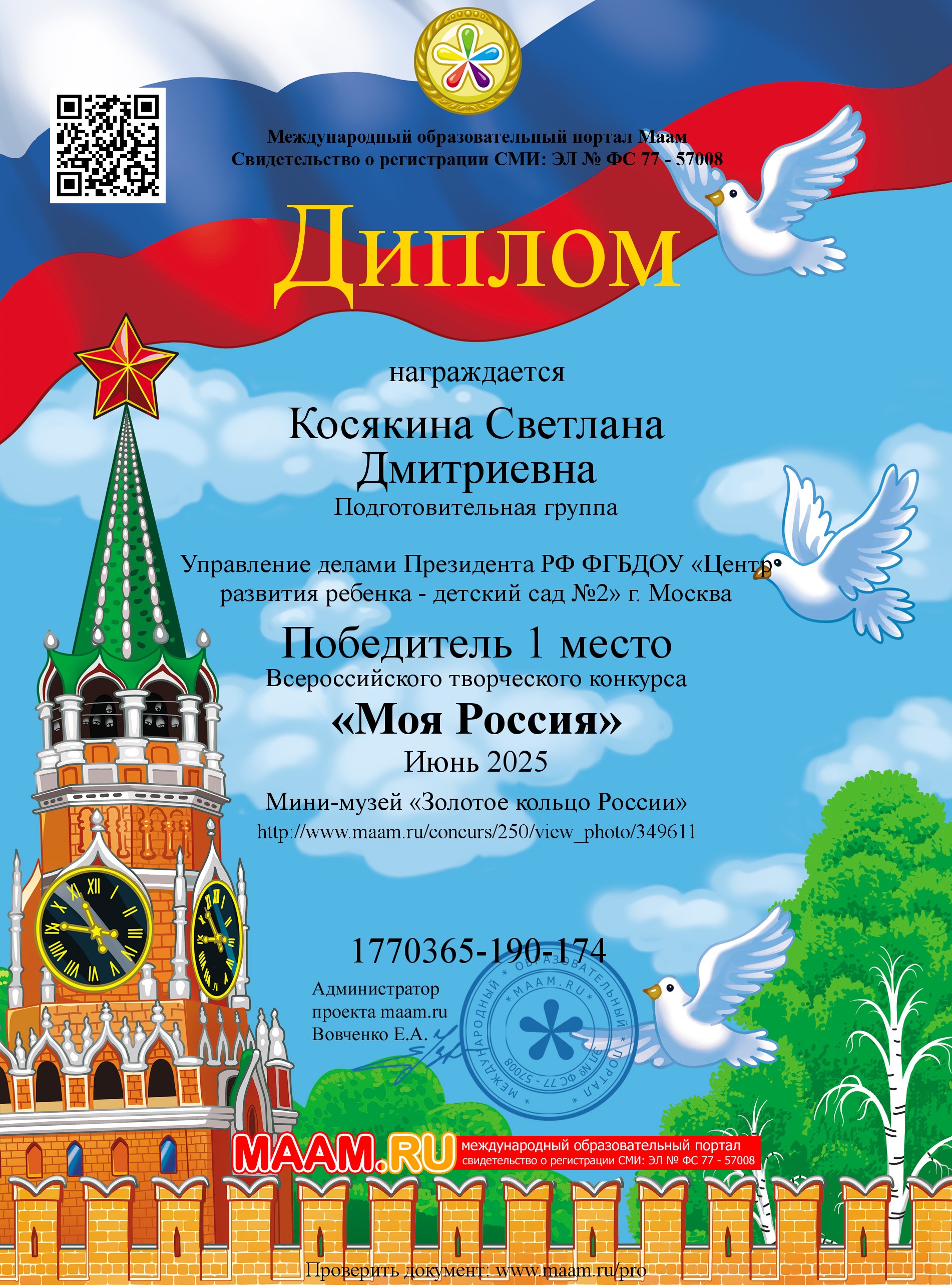Всероссийский профессиональный конкурс патриотического воспитания "Растим патриотов России". Номинация "Уголок патриотического воспитания". Работа "Золотое кольцо России"