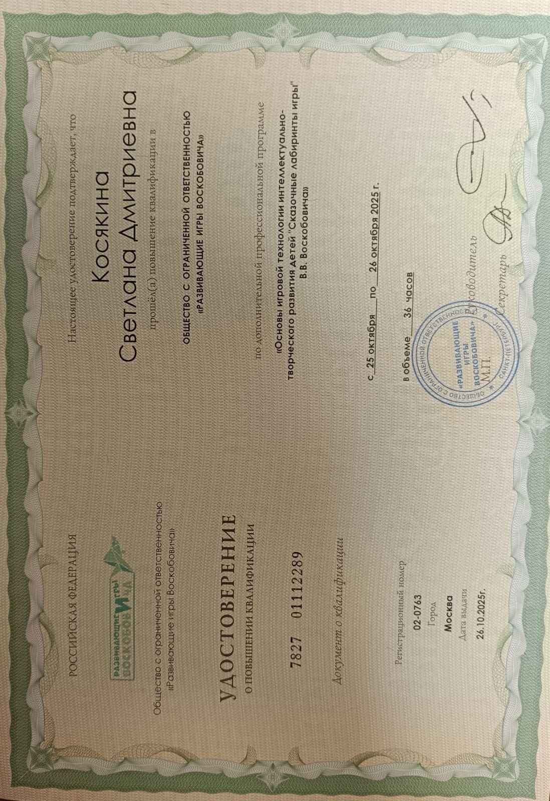 (Общество с ограниченной ответственностью "Развивающие игры Воскобовича". 36часов. Форма обучения: Очно-заочная. Направленность: методика преподавания предмета).