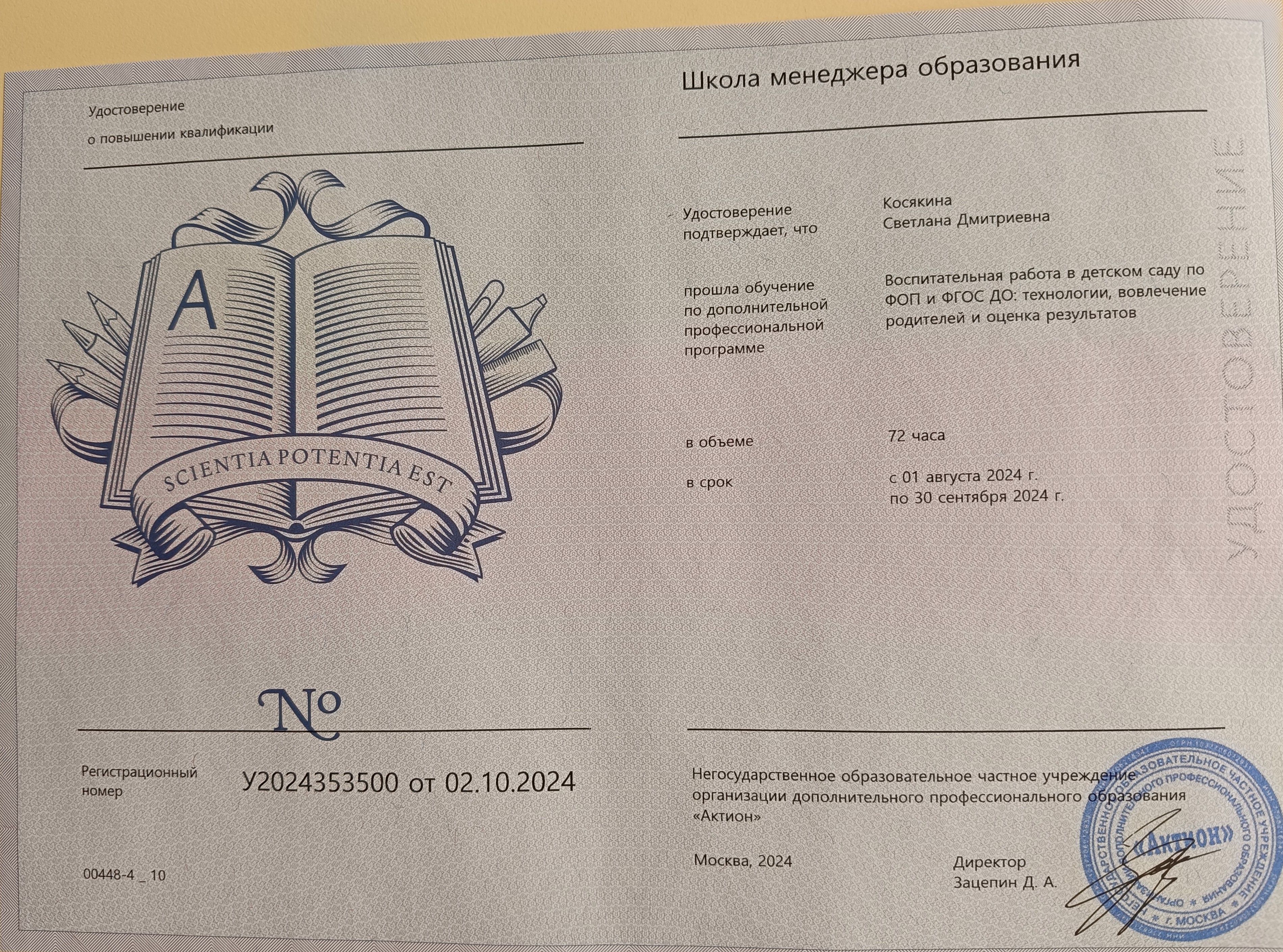 (Негосударственное образовательное частное учреждение организации дополнительного профессионального образования "Актион". 72часов.).